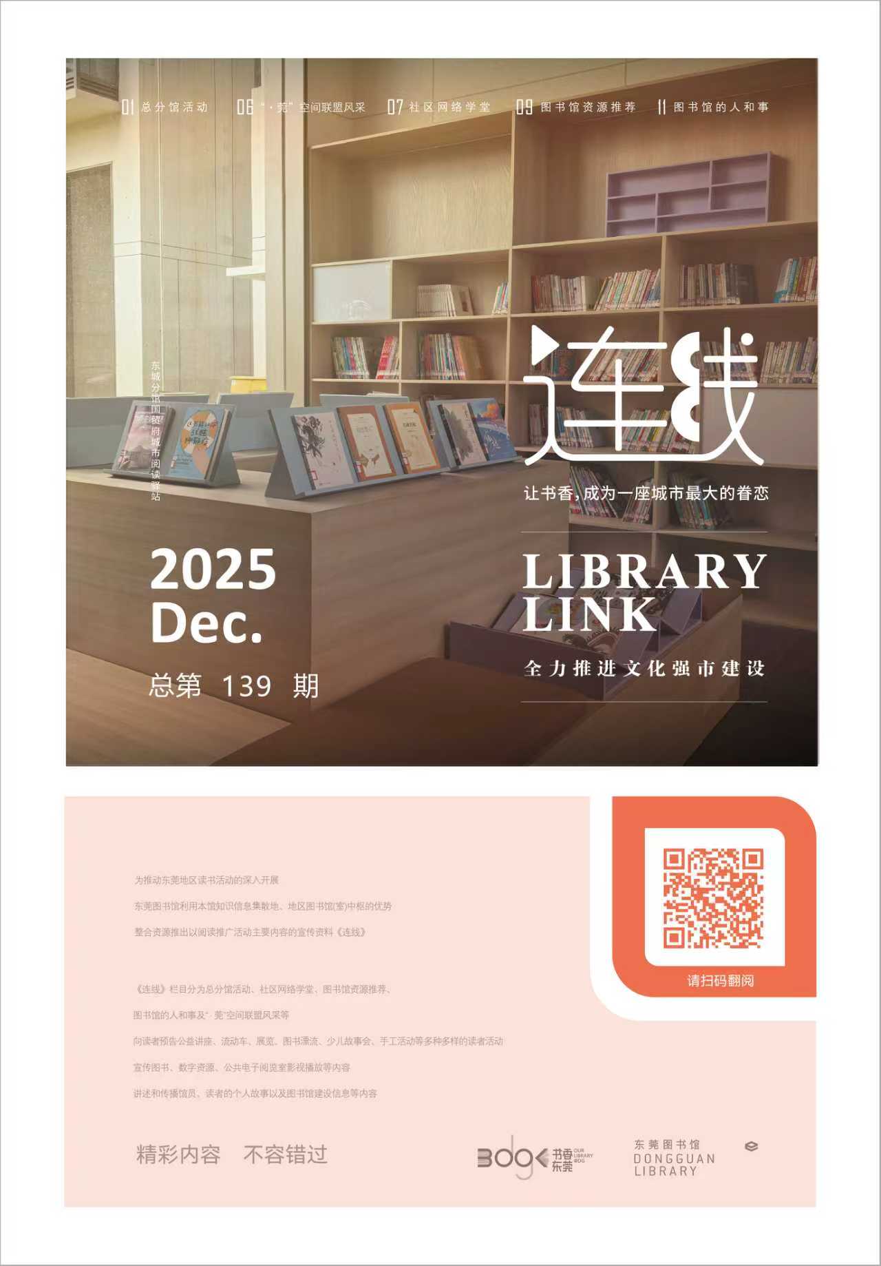 为推动东莞地区读书活动的深入开展,东莞图书馆利用本馆知识信息集散地、地区图书馆(室)中枢的优势,整合资源,于2014年2月推出以读书活动主要内容的宣传出版物《连线》。《连线》栏目氛围总分馆活动、图书馆资源推荐、图书馆的人和事等。总分馆活动主要向读者公告公益讲座、流动车、展览、图书漂流、少儿故事会、手工活动等多种多样的读者活动。图书馆资源推荐主要宣传图书、数字资源、公共电子阅览室影视播放等内容。图书馆的人和事是馆员、读者的个人故事以及图书馆建设信息等内容。