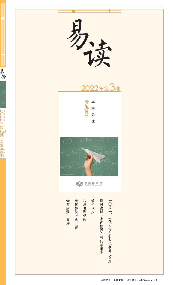简介:生于00后,意味着什么?一代人有一代人的命运,每一代人都是时代塑造的结果,每一个个体的思想、境遇、命运都有时代留下的烙印。2022年第3期《易读》主题为“发现00后”,聚焦“00后”,认识和理...